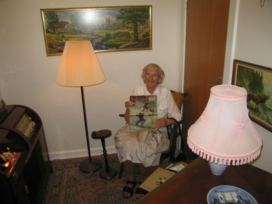 Tommy fortæller familien om båndgrammofonen. Mærket er Tefifon og af tysk fabrikat