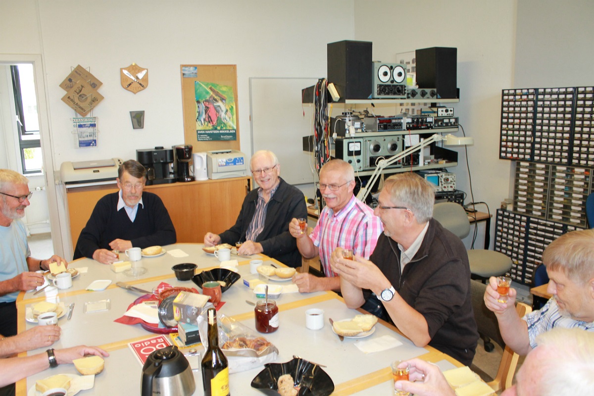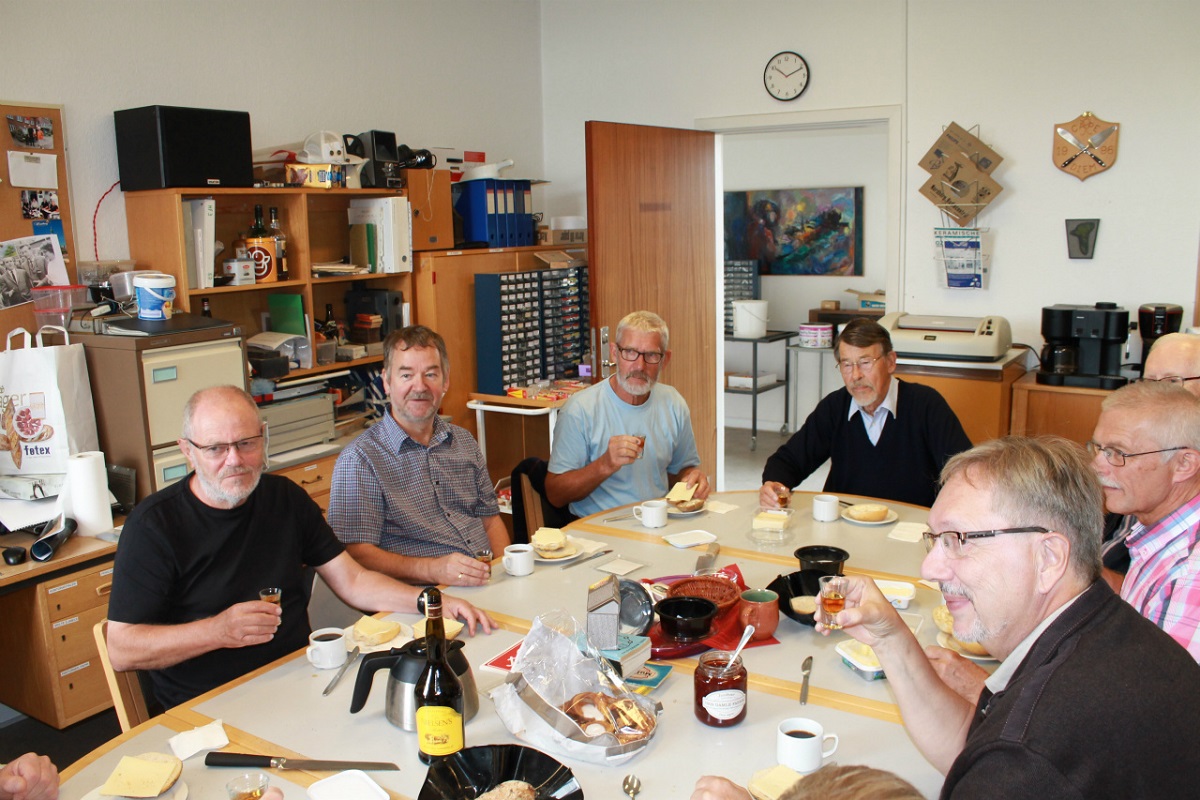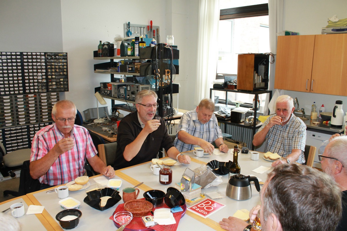 Kaffe og rundstykker nydes med Jes og Finn ved bordenden