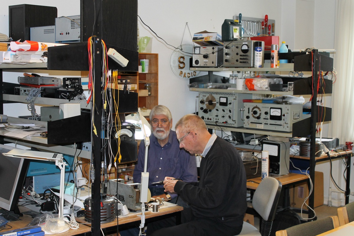 Alex og Niels renoverer "Bisbehuen" på en af fællesrummets reparationspladser