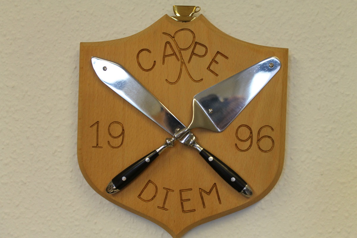 Lagkageklubbens våbenskjold, der blev fremstillet i anledning af 10 års jubileret. Her skal det royale R lige under og over centrum for henholdsvis kaffekop og "værktøjssæt" fremhæves