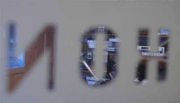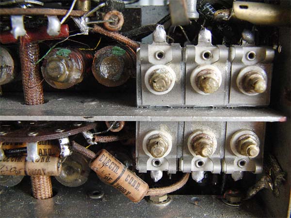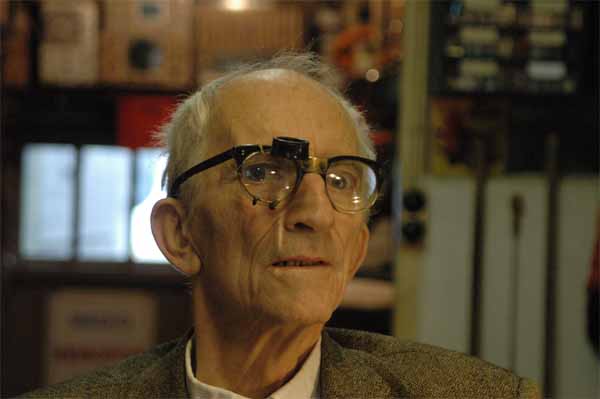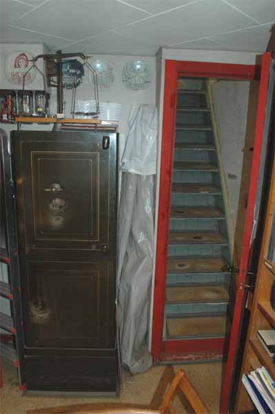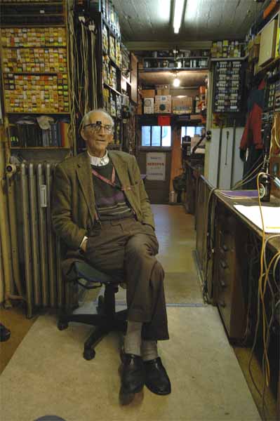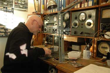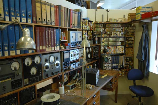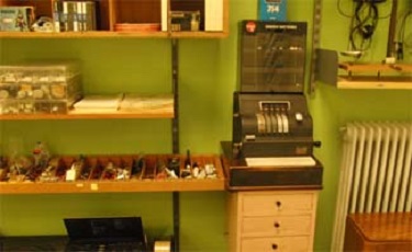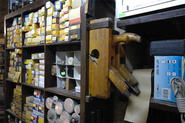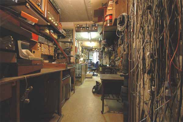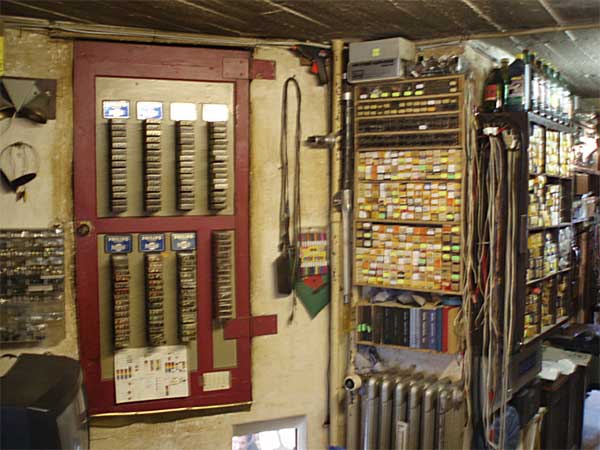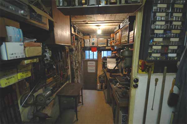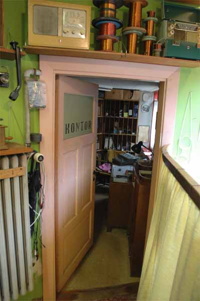 Lidt apparater, ruller med kobbertråd, og kighul så man kan se ned i butikken oppe fra værkstedet - og omvendt.