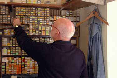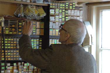 Hele værkstedet er fyldt med omhyggeligt sorterede reservedele, og Stig finder hurtigt det ønskede til kunden.