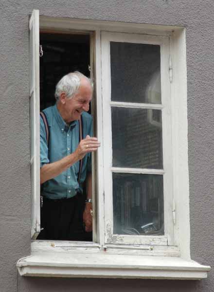 Her står Stig i vinduet til værkstedet og vinker ned til et forbipasserende marchorkester.