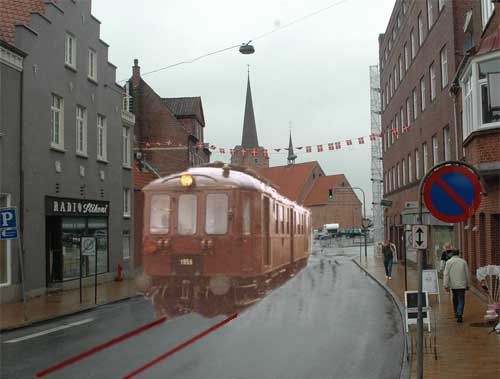 ![]() Toget på Jernbanegade (fotomontage) The train on Jernbanegade (photomontage) |