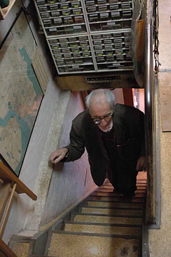 Idet jeg åbnede døren, blev Stig tilkaldt af en klokke oppe på værkstedet.