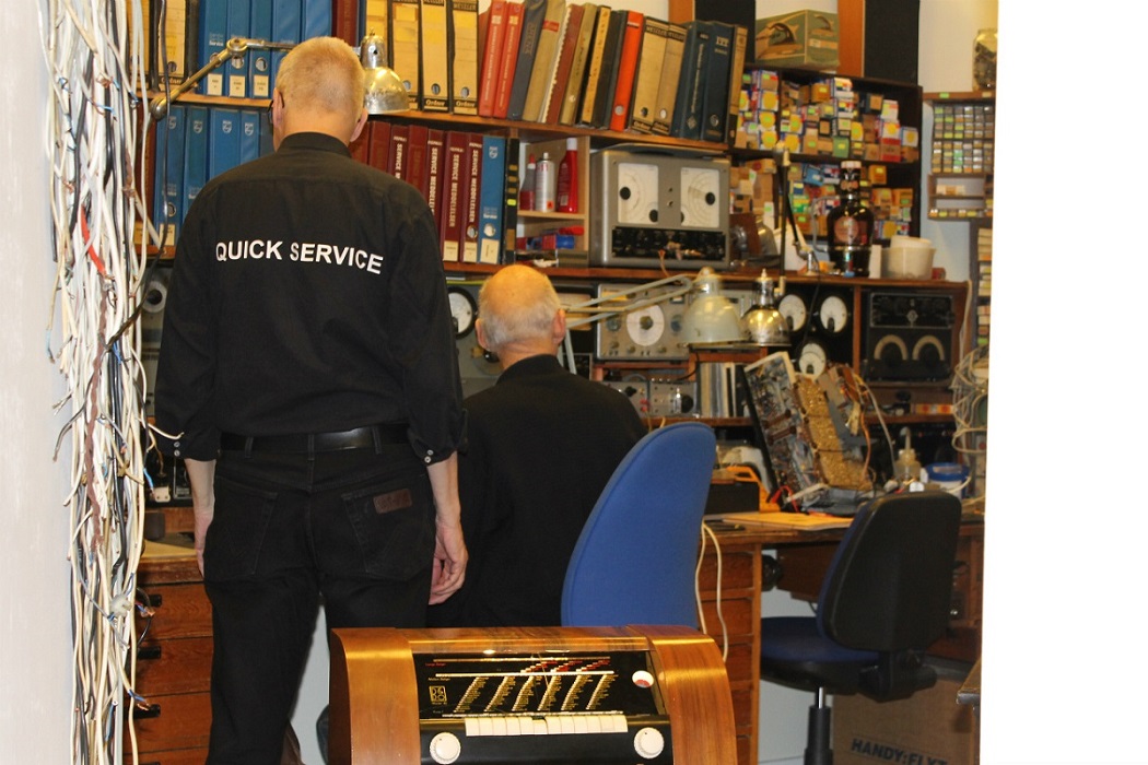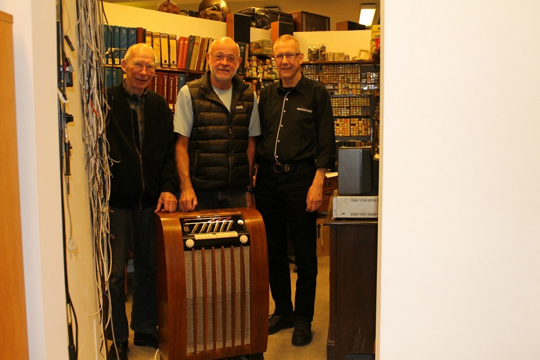 Per, Sven og Alex, der har været hovedaktører på restaureringen. I forgrunden ses Kaj Munks radio